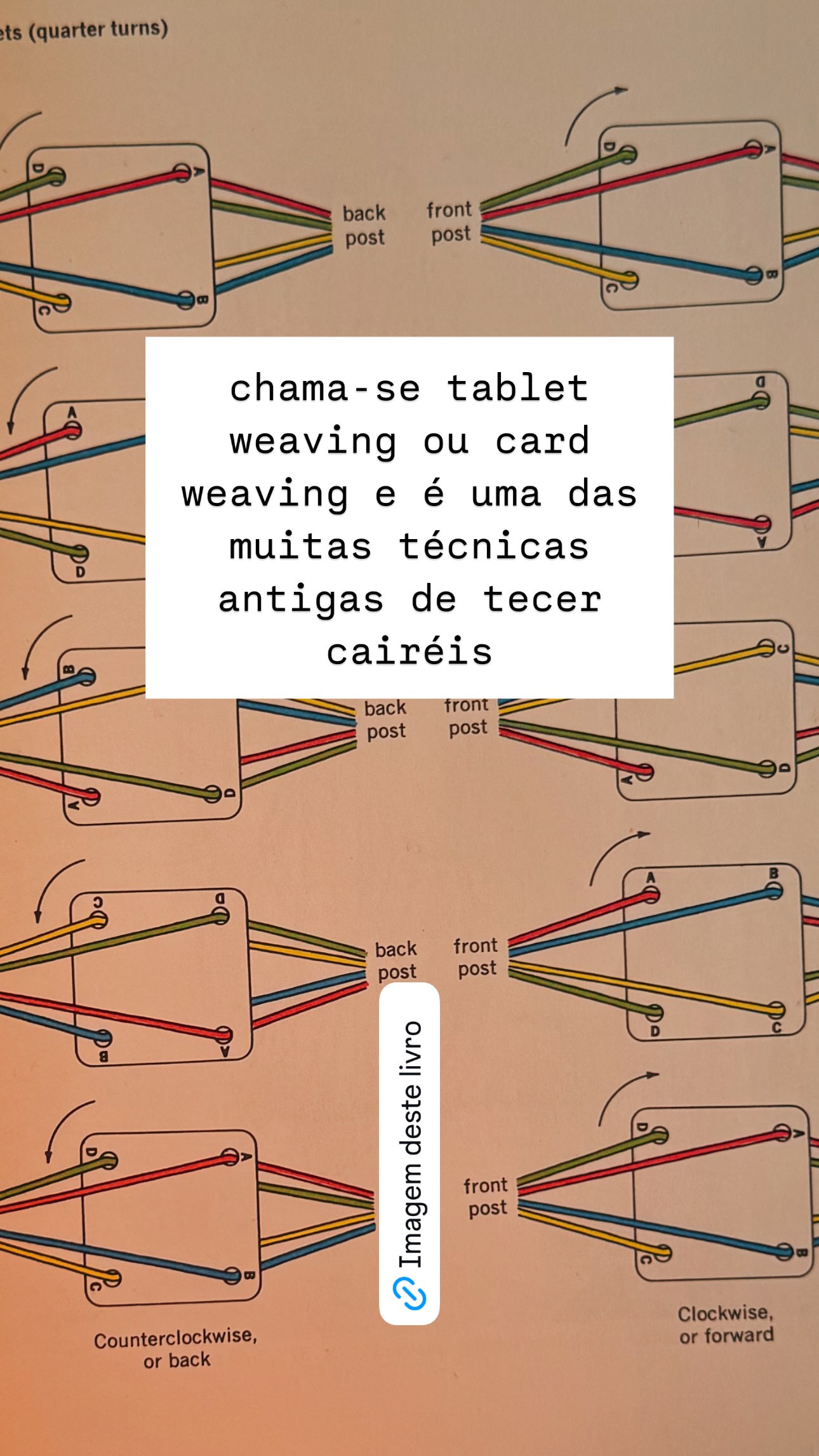 Há quinze anos encomendei um livro em segunda mão sobre tablet weaving, uma técnica de tecelagem de cairéis em que a possibilidade de tecer desenhos é criada através de tabuinhas ou placas com furos junto aos vértices por onde passam os fios da teia.